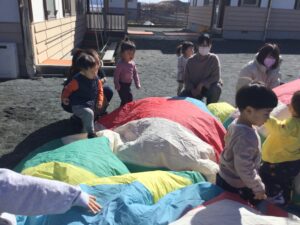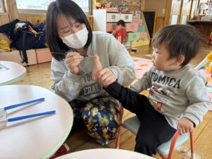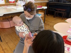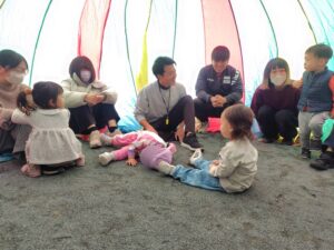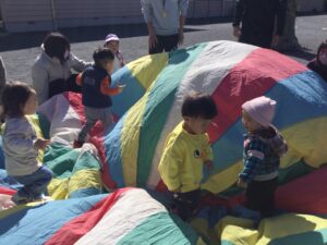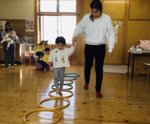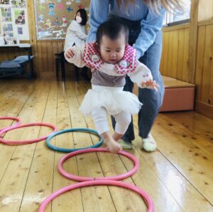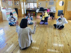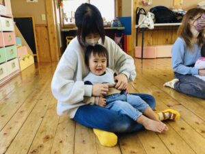 音楽に合わせて身体を動かしたり、触れ合い遊びをしたり楽しい活動でした◎